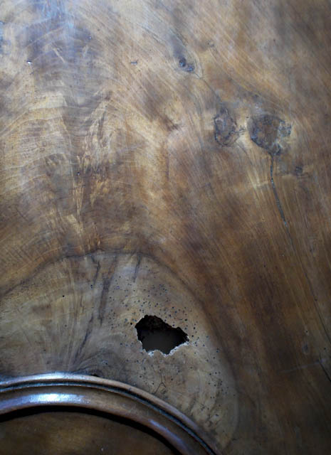 Pour la réparation des zones vermoulues des portes, je choisi d’utiliser une greffe par agglomérat de tourillons, technique déjà utilisée en plusieurs autres points de l’armoire pour combler des noeuds et des fentes.