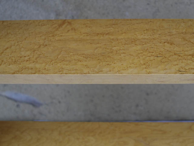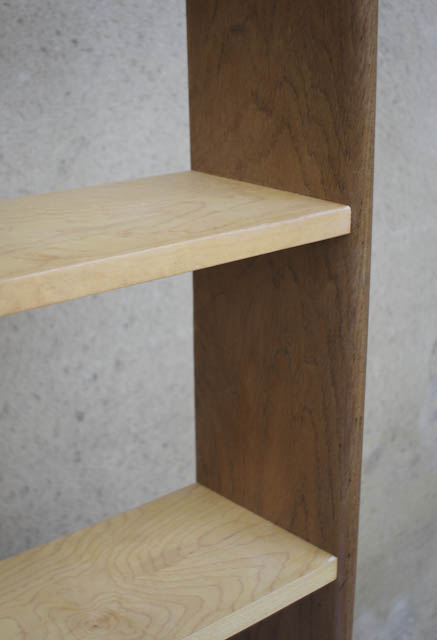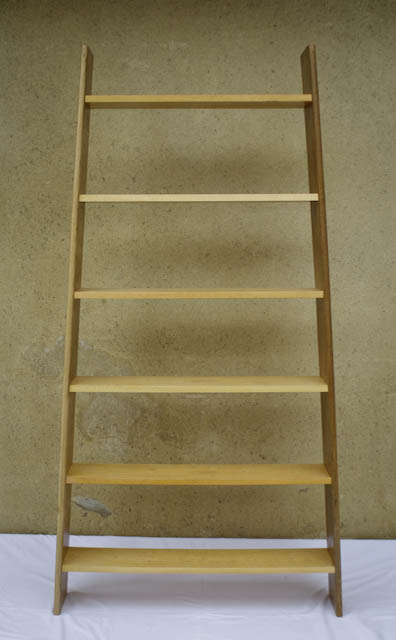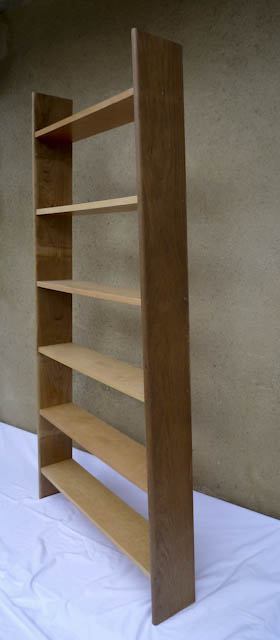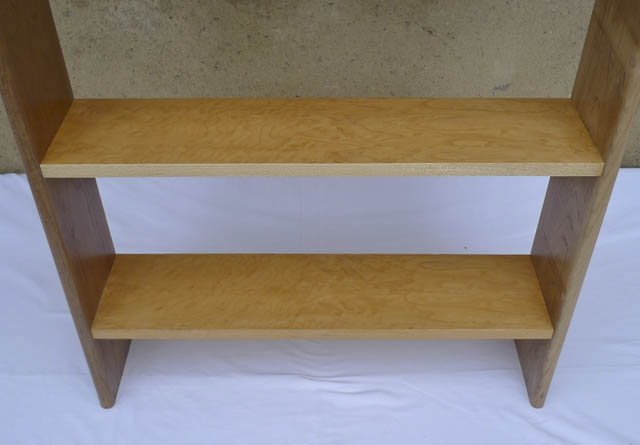Encore une création en upcycling : cette étagère est fabriquée avec les grandes planches en chêne massif d’un cosy et les étagères en plaquage de loupe de sycomore récupérées sur un buffet style Empire.
