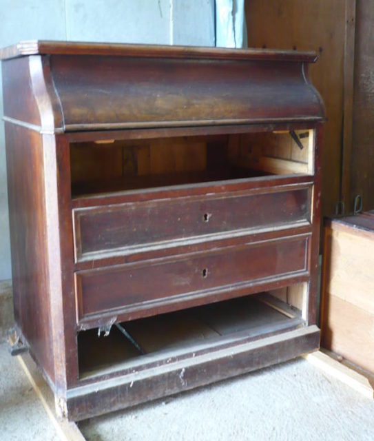 Au départ une coiffeuse Louis Philippe en plaquage de palissandre dans laquelle seuls les tiroirs sont encore en état. Ils sont grands, je les coupe en deux, ce qui me permet d’enlever la partie centrale avec la serrure. Du coup, j’avise le panneau d’une tête de lit bateau en chêne qui va me permettre de refaire des côtés.