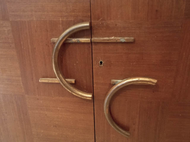 Françoise et Michel me demandent de restaurer pour leur salle à manger un grand buffet Art Déco en plaquage de palissandre. Les quincailleries sont en laiton cuivré, il est magnifique ! Enfin … après quelques heures de raclage, ponçage, nettoyage, réparations !
